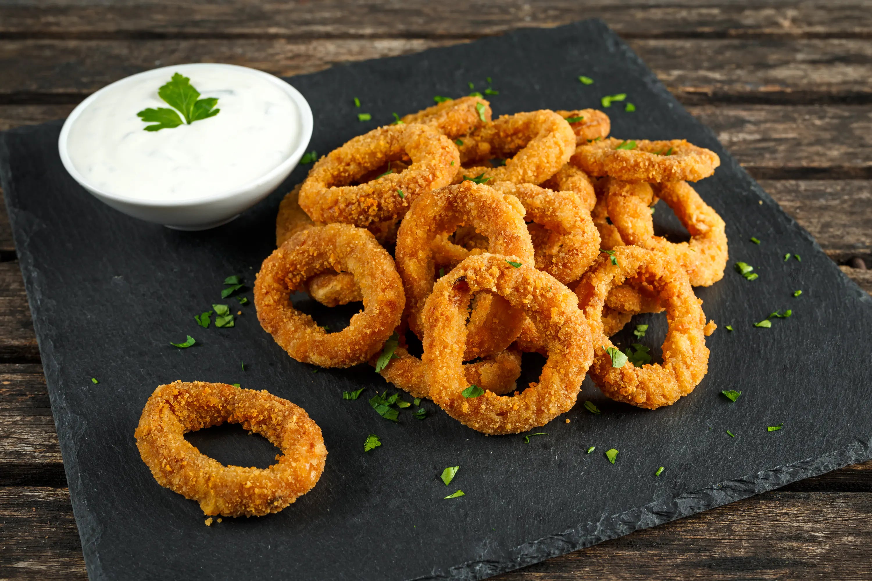 - Cut onion into thick rings and separate. Cut cheese into strips.